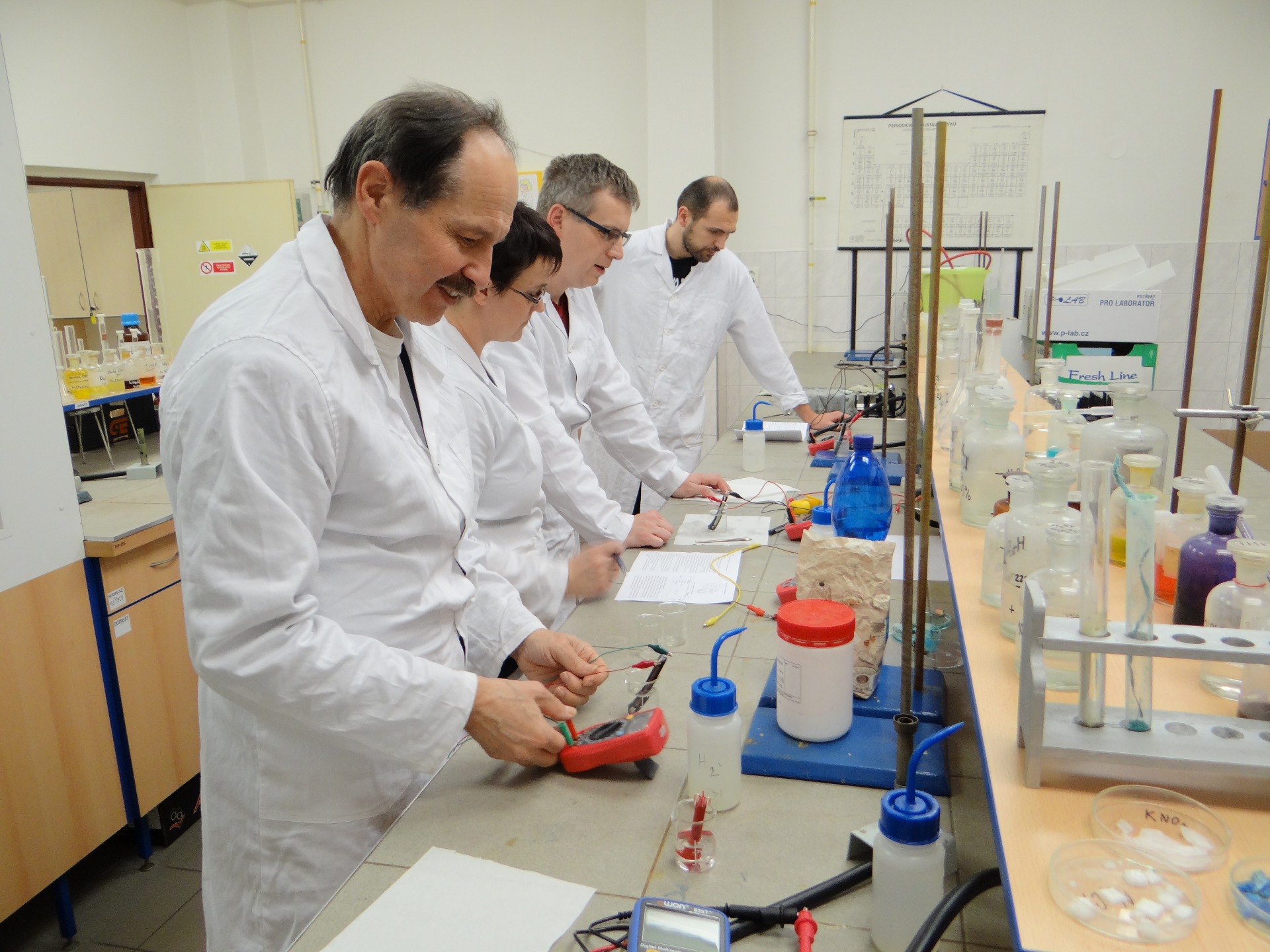 Pod vedením zkušeného lektora Mgr. Luďka Míky, Ph.D. jsme si v lednu vyzkoušeli sestrojení vodivostního čidla a s jeho pomocí jsme proměřili vodivost několika běžných roztoků. Zajímavé bylo i porovnání vodivosti iontové sloučeniny v pevném a kapalném skupenství. Setkání jsme zakončili měřením napětí poločlánků, které jsme si v laboratoři sami sestavili z nabídnutých chemikálií.