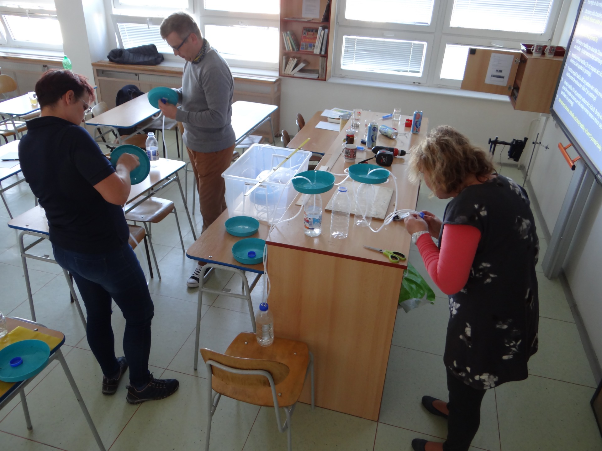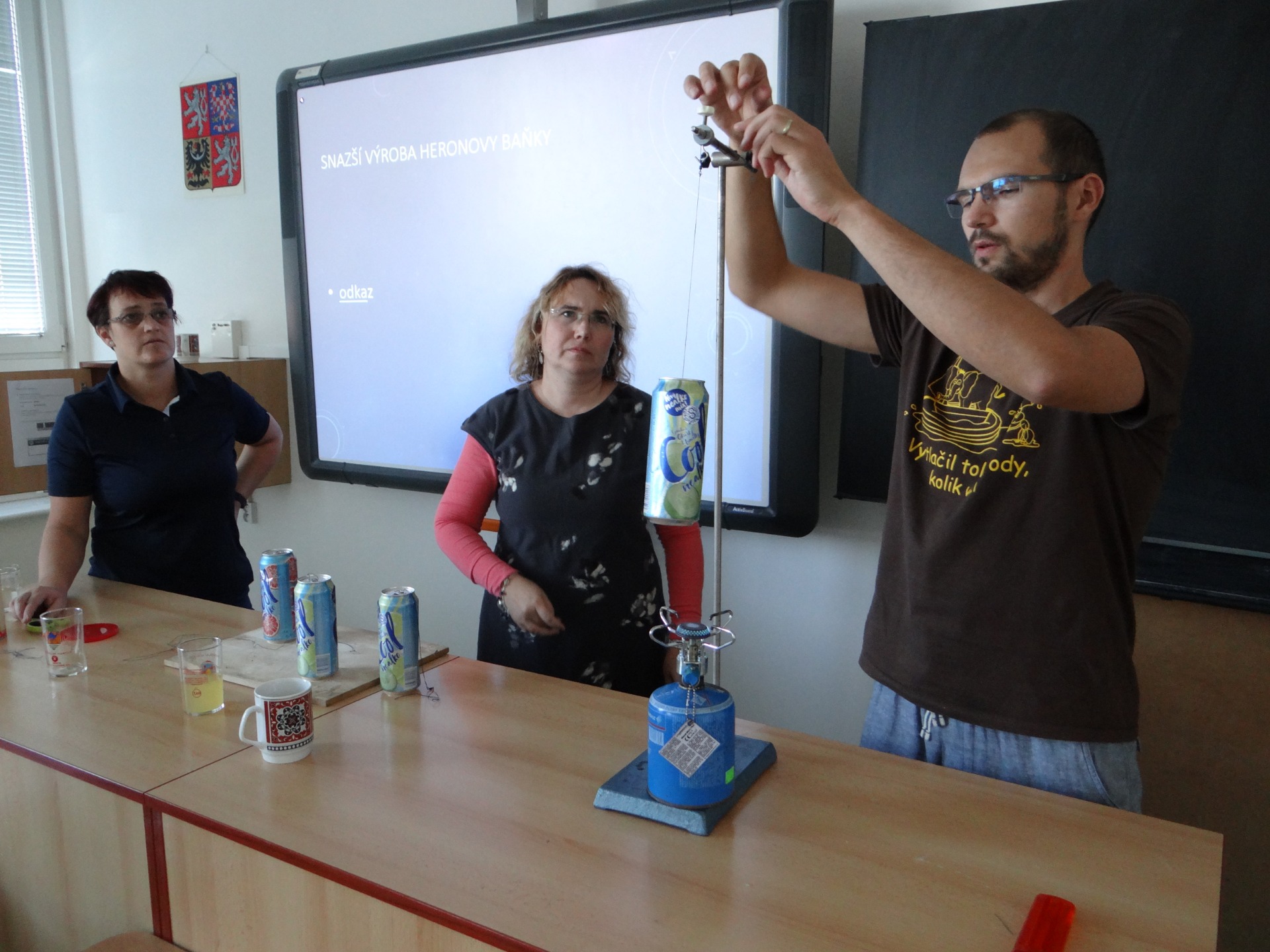 Zářijové setkání bylo inspirováno Hérónem Alexandrijským a jeho vynálezy. Hlavním cílem setkání byla výroba modelu Hérónovy fontány z PET lahví. Veškeré drobné potíže se nakonec podařilo všem vyřešit a každý si tak domů odnesl 1 funkční model. Kromě něj si ještě každý vyrobil rotující Hérónovu baňku z plechovky. A připomenout jsme si stihli i některé základní poznatky o dalších Hérónových vynálezech i jeho době.