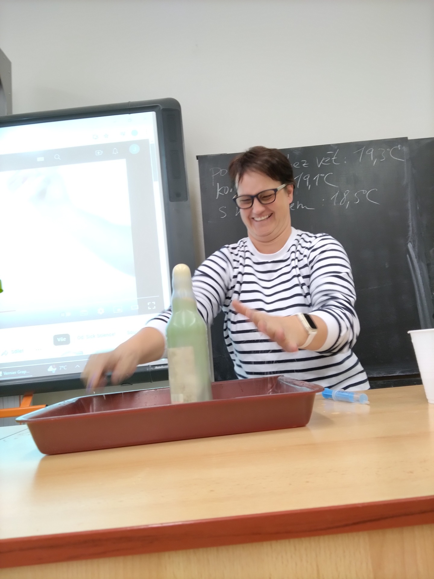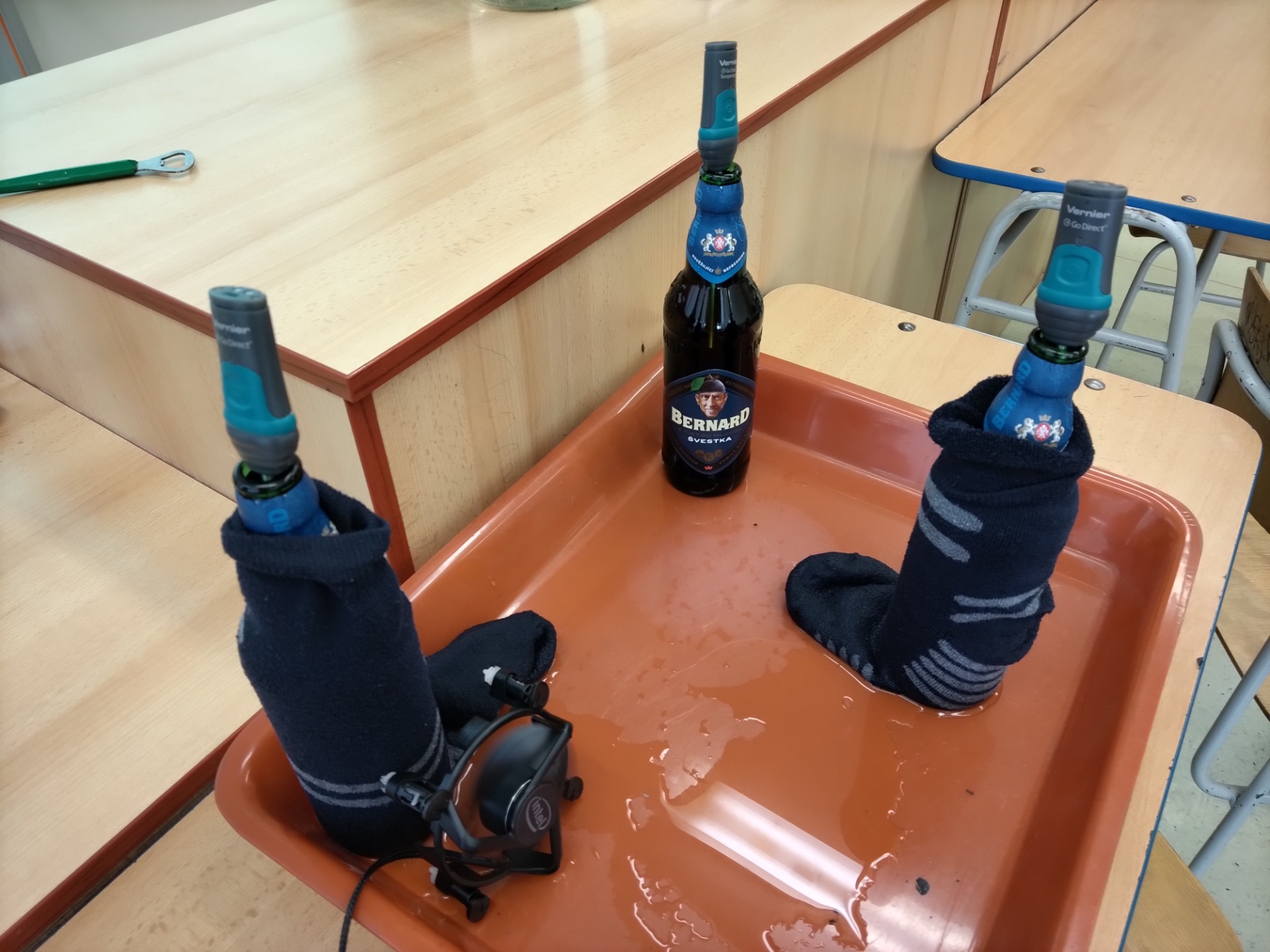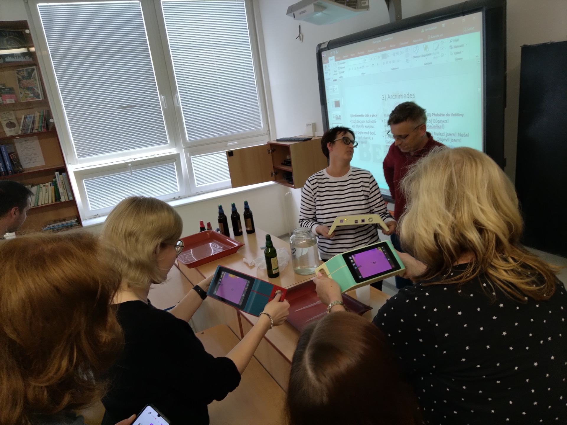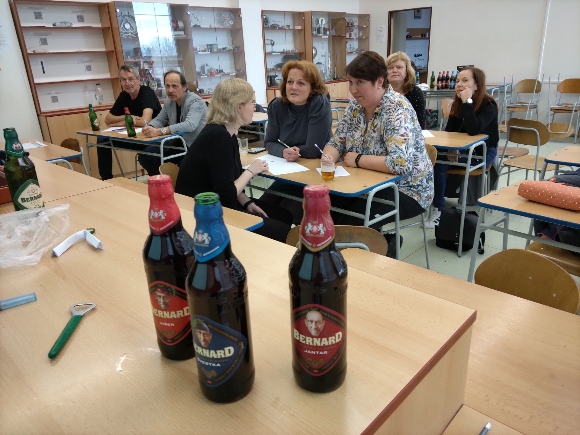 Dubnové setkání bylo ve znamení piva, nápoje který provází českou kulturu po staletí a který nabízí zajímavé náměty i pro hodiny fyziky. Naše setkání proběhlo ve stylu hospodského kvízu, kdy jsme ve skupinkách řešili různé úlohy. První úlohou bylo improvizovanou pákou (lžící) otevřít láhev s korunkovým uzávěrem. Další fyzikální úlohy se vázaly například k příčinám přílišného pěnění po otevření láhve či k účinnosti chlazení uložením láhve do navlhčené textilie. Fyziku jsme si navíc proložili otázkami z klasických českých filmů. Vítězové kvízu si ze setkání odnesli i věcnou cenu, kterou nám pro toto setkání věnoval Rodinný pivovar Bernard a. s., stejně jako i všechny ostatní láhve, které jsme na setkání využili. Pro vyučování samozřejmě doporučujeme využívat přednostně piva nealkoholická, pokud to požadavky experimentu dovolují.