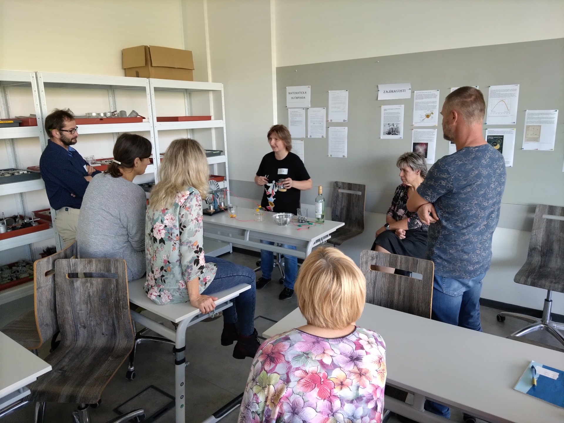 První setkání v Třebíči byly naším tématem laboratorní práce. V úvodu Eva Dvořáková ze SPŠ Třebíč představila několik svých postřehů a výrobků z Dílen Heuréky. Základem setkání tak byly diskuse a sdílení zkušeností s laboratorními pracemi ve výuce fyziky. Zajímavé bylo zejména srovnání měření fyzikálních veličin podle podrobného pracovního listu a heuristicky vedené zkoumání vztlakové síly. Účastníci si mimo jiné vyrobili pomůcky právě pro zkoumání vztlakové síly.