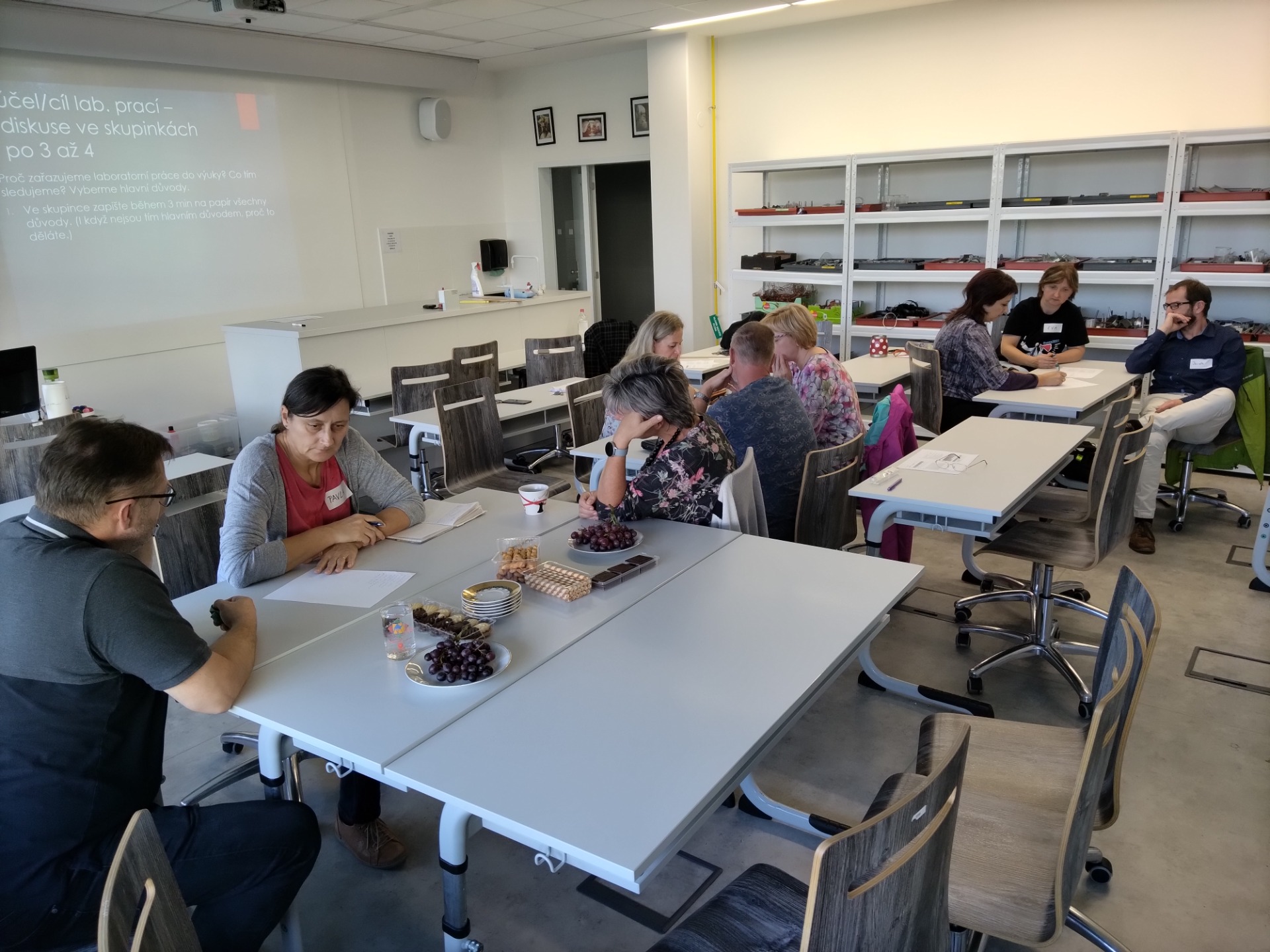 První setkání v Třebíči byly naším tématem laboratorní práce. V úvodu Eva Dvořáková ze SPŠ Třebíč představila několik svých postřehů a výrobků z Dílen Heuréky. Základem setkání tak byly diskuse a sdílení zkušeností s laboratorními pracemi ve výuce fyziky. Zajímavé bylo zejména srovnání měření fyzikálních veličin podle podrobného pracovního listu a heuristicky vedené zkoumání vztlakové síly. Účastníci si mimo jiné vyrobili pomůcky právě pro zkoumání vztlakové síly.